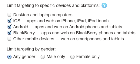 In addition to these interest targeting options, self-service advertisers can now specify the exact devices and platforms to have Promoted Tweets display. This means a game developer can choose to target Android devices with campaigns to download Android-specific apps with their campaign, and Apple devices to drive them to the App Store. We’ve also added the ability to target by gender (which we extrapolate using public user signals) for situations where marketers want to reach specifically men or women.